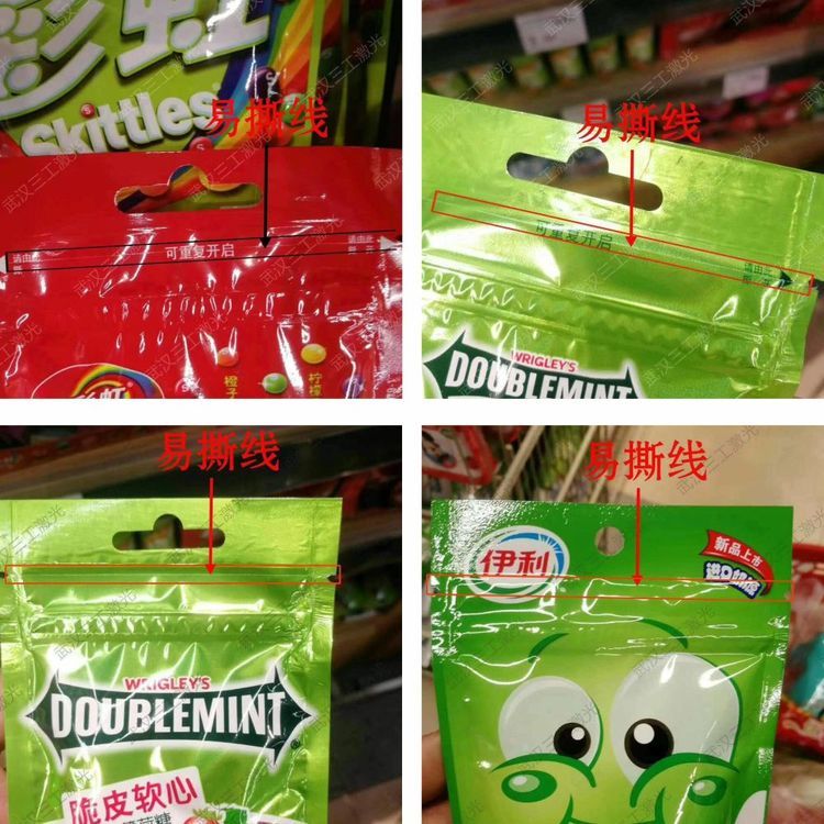 食品包装袋易撕线是一种设计在食品包装袋上的线状结构,用于方便消费者打开包装。它通常是在食品包装袋的封口部分附近设置的一条预定的线,可以通过轻微的拉力将包装袋撕开。这种易撕线加工其实很简单,一台激光打孔机就能实现。