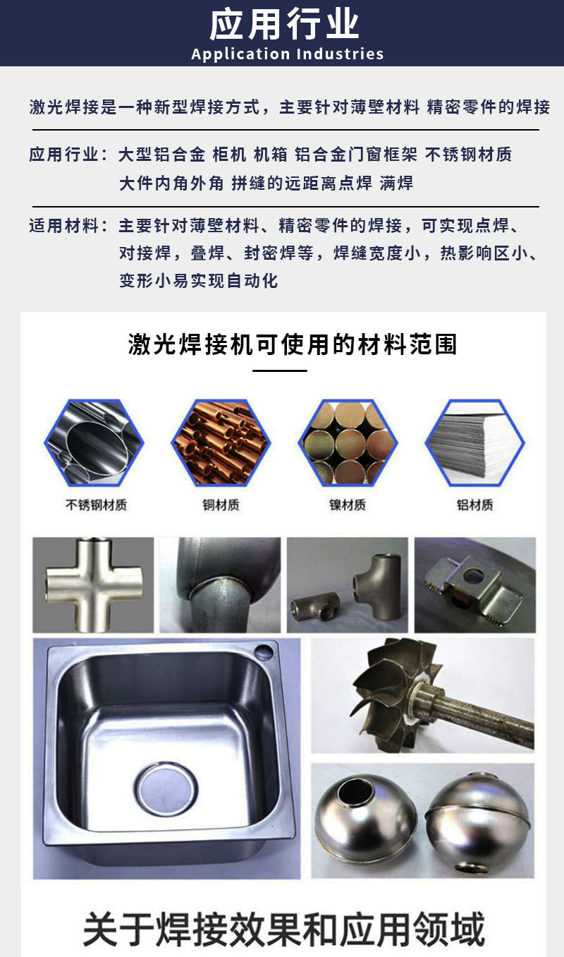 适用材料:主要针对薄壁材料、精密零件的焊接,可实现点焊,对接焊,叠焊、封密焊等,焊缝宽度小,热影响区小、变形小易实现自动化